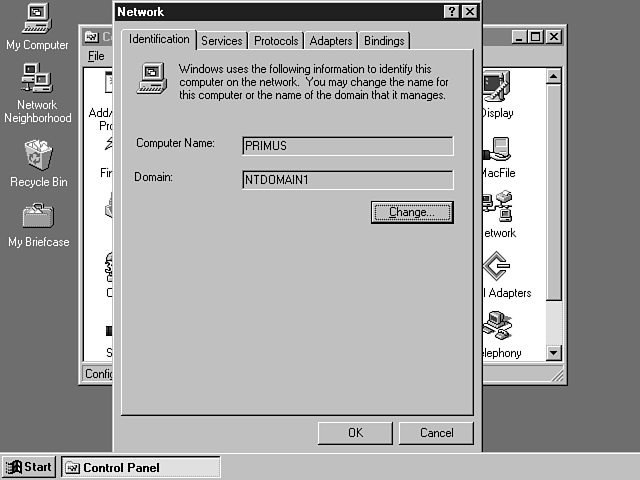 NOTE: A common problem point is that people don't understand how the computer name and domain information entered into this screen differ from the computer and domain information entered when NT was installed. Here are some tips: