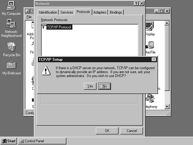 In this example, you should choose No. If, however, you were configuring an NT Server and you did want it to dynamically obtain its IP address from a DHCP server, you would choose Yes. For more information on setting up a DHCP server, see Chapter 12.