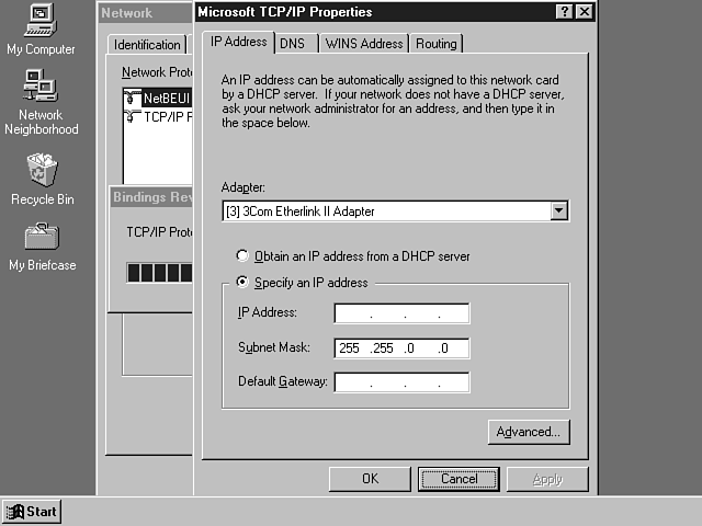NT will go through an automatic process to review the bindings on the network adapter. NT will display the Microsoft TCP/IP Properties window so you can provide specific TCP/IP configuration information, which is necessary to complete the binding. The Microsoft TCP/IP Properties window is shown in Figure 11.6.