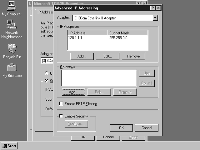 Once TCP/IP is installed, if you need to configure additional IP addresses or IP gateways, use the following procedure: