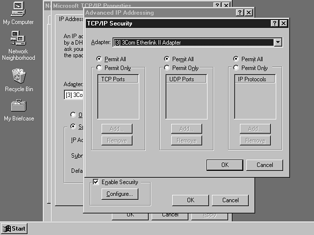 One of the new features of Windows NT 4.0 is the ability to filter network traffic by TCP or UDP port number, as well as IP protocol value. This allows you to control the type of TCP/IP traffic that your server will respond to, providing a higher level of security. For instance, if you were running a SQL server on your system, you might want to permit access only to the ports your databases listen to.