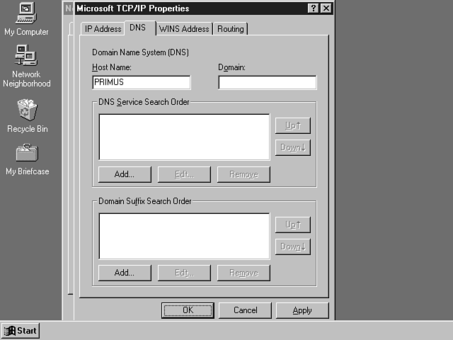 The following set of procedures explains how to configure the items in the DNS tab of the Microsoft TCP/IP Properties window.