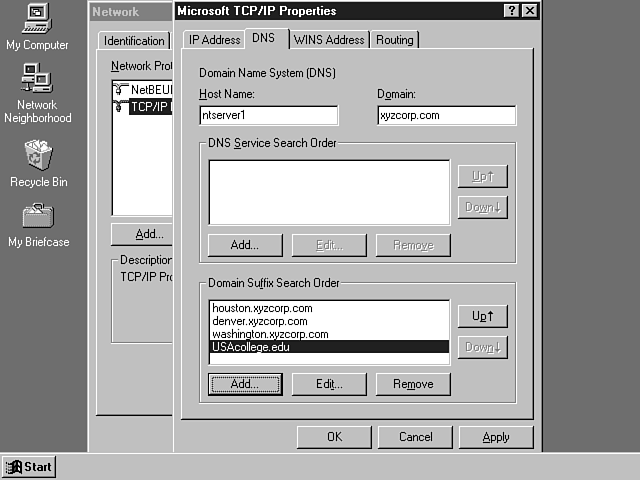 Given this setup, if you typed ping server1 at the command prompt, NT would first try to locate a machine called server1.xyzcorp.com, since xyzcorp.com is my DNS domain. If a machine by this name is not found, it would try server1.houston.xyzcorp.com, server1.denver.xyzcorp.com, server1.washington.xyzcorp.com, and finally server1.USAcollege.edu, until a valid machine is found. At this point, if no machine is found, you will get an error message.