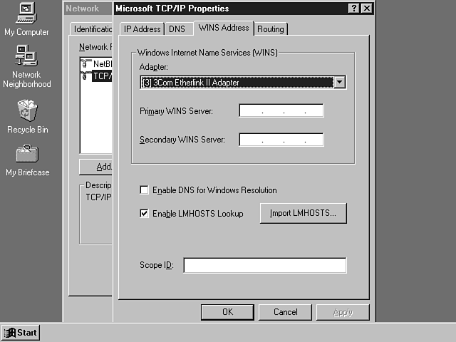 The WINS Address tab in the Microsoft TCP/IP Properties window enables you to configure your NT system to take advantage of any WINS servers available on the network. Additionally, it provides you more methods of Windows name resolution, such as using DNS for Windows name lookups and LMHOSTS files. For more about theses services, please see Chapter 12.