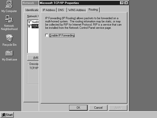 You also saw how TCP/IP integration enhances connectivity with Windows for Workgroups and Windows 95 clients through a robust implementation of NetBIOS over TCP/IP. The chapter continued with an explanation of how to install and configure TCP/IP on Windows NT Server, including an explanation of how to install and configure additional TCP/IP-related services, such as IP Routing and simple TCP/IP services.