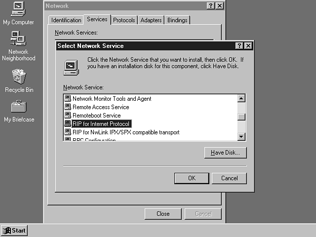If you also want to enable dynamic RIP routing, you must install the RIP for Internet Protocol service. Continue with the following procedure to install this service as well: