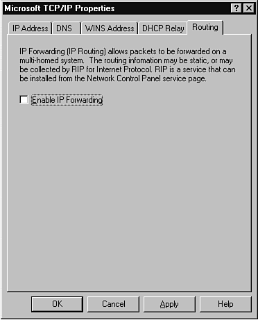 Windows NT Server supports static IP routing (IP forwarding) on multihomed systems. Until the 4.0 release, NT Server was capable of static IP routing only. This allowed you to configure NT to work with other static IP routers on the network. Under this configuration, you need to use the route command to create static routes. However, with NT Server 4.0, Microsoft includes a Routing Information Protocol (RIP) agent that allows NT Server to collect RIP information from other routers on the network.