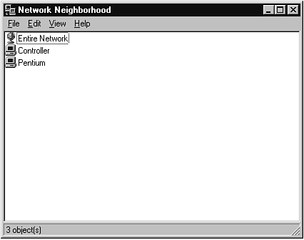 To open the interface for browsing the resources a network has to offer, you double-click the Network Neighborhood icon on the Windows NT desktop. This has become the standard user interface for browsing network resources for both Windows 95 and Windows NT. And its a good thing, too. Until this interface was developed, users had to use the File Manager to browse network resources or the command-line utility NET.EXE to browse. Figure 14.1 shows the Network Neighborhood window.