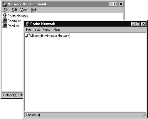 Double-clicking the Entire Network entry in the Network Neighborhood enables you to browse all domains accessible to the current machine. Note that it is possible to see network systems and resources without actually having access to use them.