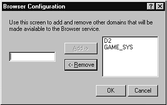 You can double-click the Network icon in the Control Panel to alter the browse service of an NT Server to manually include foreign domains for browsing purposes. Figure 14.3 shows the Add Domain element of Control Panel. To add a foreign domain to the browse list, follow these steps: