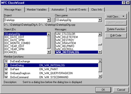 Щелкните на кнопке Edit Code. В ответ Visual C++ откроет файл DateAppDlg.cpp c функцией OnInitDialog() в режиме редактирования.